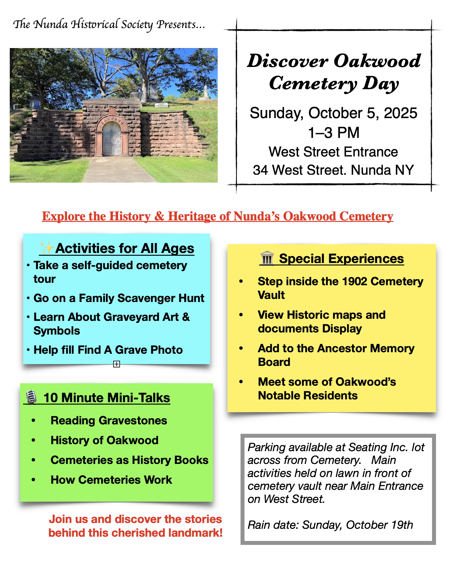 Sunday, October 5, The NHS Presents "Discover Oakwood Cemetery Day! Lots of free activities for all ages - see the poster for details! Rain date is Sunday, October 19th.