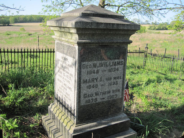 The Williams Family Cemetery on Short Tract Road is the resting place of local pioneer George Williams and his family.On May 20th a small group of Friends did a much needed cleaning of the historic cemetery. Right: Joan Schumaker, Jim McMaster and Tom Cook are hard at work cutting back the berry bushes and other brush in and around the plot. Trees were also trimmed back. Bottom left: Only three stones remain in the cemetery. The family stone, shown here is in good condition. The Friends also placed a new American flag at the grave site. The names shown are the children of George and Alma Williams. Bottom Right: Almost done! The cemetery looks much better! |
