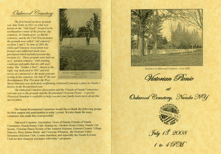 We had hoped to have a traditional victorian style picnic in Oakwood Cemetery, but heavy rains in the morning sent us to the Nunda High School gym. But the weather couldn't dampen the bicentennial spirit shown by those who took part in this wonderful event! |