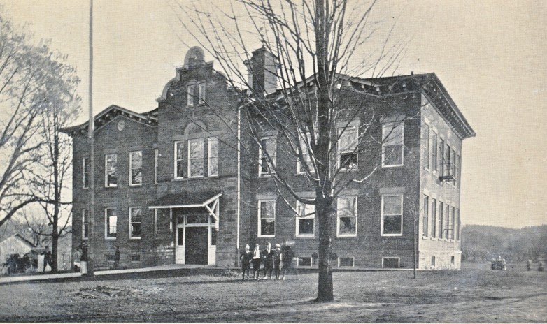 The school to the right was the Nunda High School as it looked around 1920. By this time original Nunda Academy (the section on the right) had been expanded to accommodate more public school students. At one time two district schools (one room schools) stood on the front lawn. The present day school was built around this building in 1938-39 and the old school was razed. |
