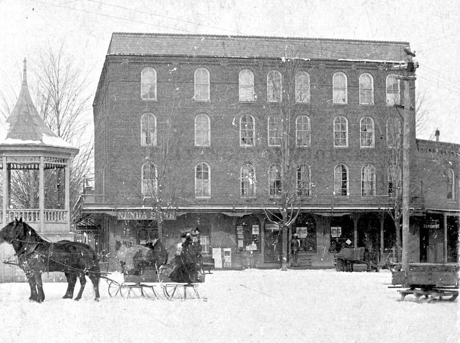 Above: If you were standing in the south end of the Village Square around 1840 looking north, this is what you would see. The buildings on the right (Merchant's Row) are still standing. Several of the buildings on the left (Farmer's Exchange) also remain. The old Eagle Hotel once stood at the north end where the Livingston House now stands.